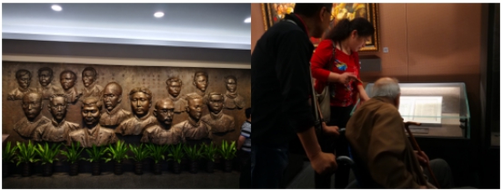 走進(jìn)"一大"會(huì)址,首先映入眼簾的是13位中共代表及2位共產(chǎn)國(guó)際代表銅頭像。他們是毛澤東、何叔衡、董必武、陳潭秋、王盡美、鄧恩銘、李達(dá)、李漢俊、張國(guó)燾、劉仁靜、陳公博、周佛海、包惠僧及荷蘭人馬林和俄羅斯人尼柯?tīng)査够笫诌吺蔷薹h旗,重溫入黨誓詞,激情澎湃,激蕩回響。忽然,我看見(jiàn)一位老人坐著輪椅被推到成列窗前,旁邊的女子大聲給老人講解并手指相片,可能老人耳朵聽(tīng)不清,久久凝視,用顫抖的右手撫摸著放照片的成列窗玻璃,張張嘴,笑了。這一場(chǎng)景我的心顫了,我看到老人眼里含著淚笑,而我卻哭了……