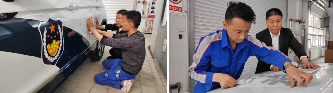 圖5為:售后漆工冶龍正在為警車貼警徽標志,他說:“警車是公務(wù)用車,每次粘警飾我都感到很神圣,干活兒特別用心細致,一定要把車身警飾做得非常好才行。警徽閃耀,守望千家萬戶。我是漆工也是工匠,必須精益求精,把活兒干漂亮,這也是汽貿(mào)漆工的臉面。每次我都把車清洗干凈,用卷尺量好間距,用記號筆畫好。在貼的過程中用刮板反復(fù)擠壓空氣,這樣才能使警徽粘得更牢固更美觀。我要把公司倡導(dǎo)的勞動精神、工匠精神,通過不斷地學(xué)習(xí)鍛煉,提高本領(lǐng),把精湛的工匠手藝和貼心的服務(wù)傳遞給社會。